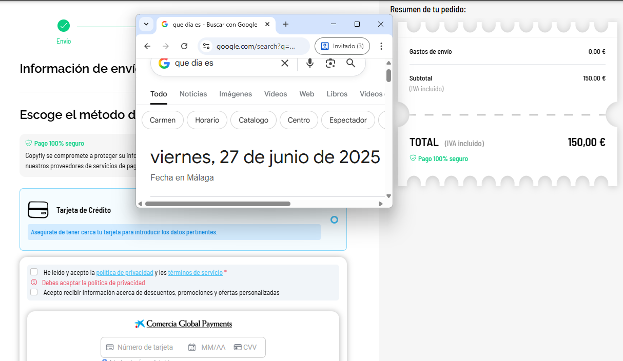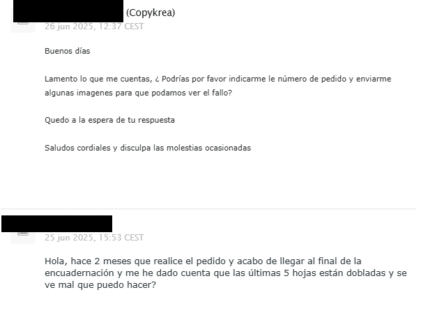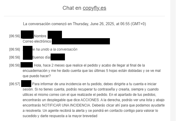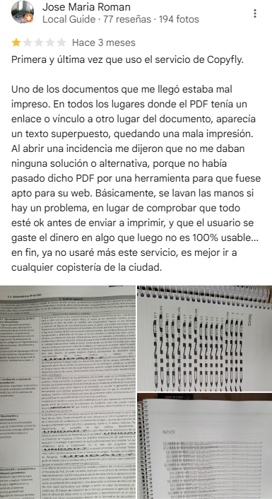Una vez vista la rapidez de pedido tenemos que evaluar sus condiciones de envío. A destacar solo tenemos 2, Iriscopy que no me deja enviar el formulario de contacto. Además no ofrece garantías ni devoluciones a sus clientes en su web, he escaneado el aviso legal a dia 27/06/2025 y en la web de archive.org puedes ver como era. Otra empresa a destacar es Copyfly, Es una de las empresas que más condiciones de compra tienen y en las que más cosas hemos visto que hay que destacar, la web también la hemos escaneado y se puede ver en archive.org. En la clausula 12.3 incidencias, exponen que si subes en pdf en RGB en vez de CMYK y si no le das al botón de aplanar pdf, y te llega mal, es tu culpa y no es incidencia (Abajo hay un ejemplo de una reseña que se queja de esta clausula). También hemos visto que en la clausula 12.2 si decides rehacer tu pedido porque te has equivocado, (en otras copisterías puedes cancelar y te devuelven el dinero) Copyfly tiene un botón para rehacer tu pedido. Si pinchas ahí en vez de cancelar, te devuelven el dinero en el monedero de Copyfly y no a tu tarjeta de crédito (Si no quieres imprimir nada más en la web, lo has perdido).
