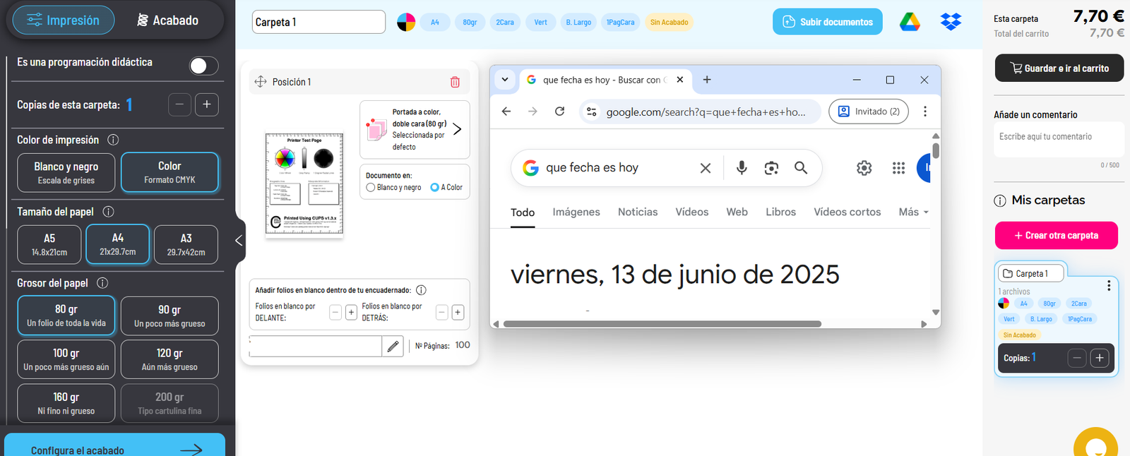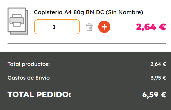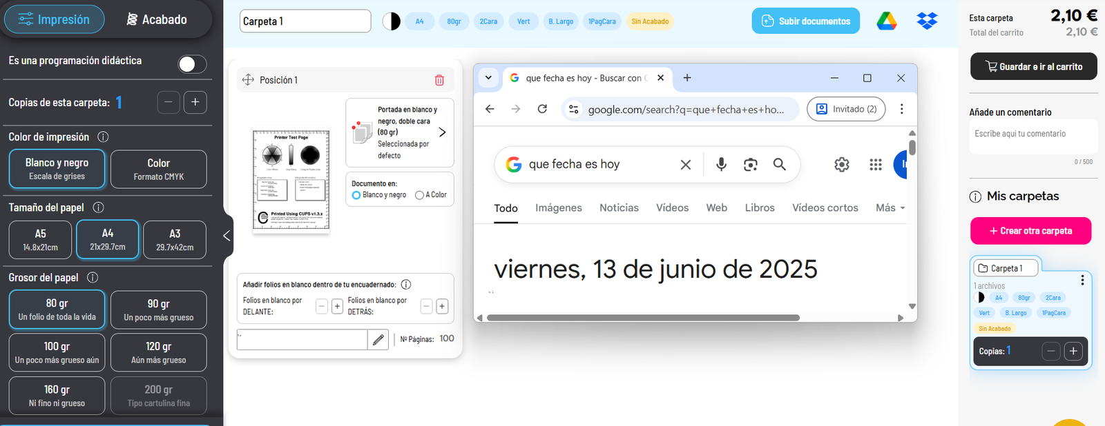 En su web dicen que sus precios son desde 0,019 el blanco y negro y 0,58 el color. Lo hemos puesto a prueba para ver si es correcto subiéndole un archivo de 100 páginas a doble cara tanto en blanco y negro en el color más barato. Y hemos visto que el precio real del blanco y negro es 0,028 y el color 0,076.