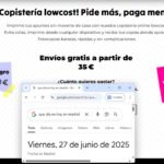 Finalmente, sobre publicidad engañosa, Copyfly e Iris Copy destacan negativamente. Copyfly anuncia precios más bajos (0,019€ en blanco y negro) que no se reflejan al hacer el pedido (0,021€), y su cupón «cfly» no es válido para todos los casos. Iris Copy también muestra precios iniciales (0,019€) que suben al realizar el pedido (0,028€). Estas prácticas, aunque no ilegales, son engañosas y afectan la confianza del consumidor.